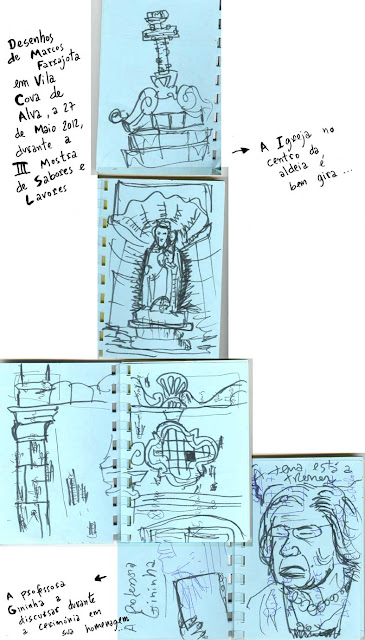 Desenhos montados do meu diário gráfico na visita a Vila Cova de Alva. Estes esboços e outros de outros autores da Associação Chili Com Carne irão aparecer no site da XJAZZ que promove eventos envolta do jazz nas aldeias de xisto. Os autores da Chili estão a fazer "BDs reportagem" dos eventos e serão publicadas na revista jazz.pt. No meu caso a BD será a meias com a cara metade Joana Pires, em modo de fusão "light"... Depois vocês vêem!